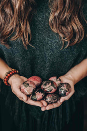 Rhodonite is a stone of the heart. It guides us to find, nurture, and create unconditional love and healthy relationships in all forms. It helps free us from stagnant patterns that keep us from truly living by the heart. Once we embody this experience, then and only then, can we radiate love to the world.